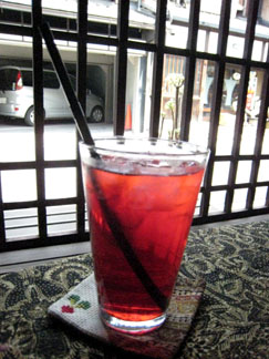 左の飲み物は、エジプトの紅茶、カルカデです。